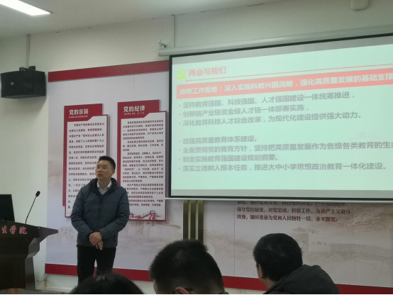 活动中,张孝刚同志结合全国两会工作报告和公司食品质量与安全专业实际为同志讲授了题为《学习贯彻全国两会精神重视专业调整狠抓专业和团队建设》的专题党课。张孝刚同志深入分析了全国两会政府工作报告中关于深入实施科教兴国战略,强化高质量发展的基础支撑相关内容。结合教育部等五部门关于印发《普通高等教育学科专业设置调整优化改革方案》的通知,他进一步剖析了食品质量与安全专业发展过程中面临的瓶颈和突破方向并强调要重视优化学科专业和资源结构布局、加强用现代数字教育手段武装自己头脑,落实立德树人根本任务,弘扬教育家精神,建设高素质专业化教师队伍。同时,大家要认真思考本专业当前面临的发展难和发展慢问题以及未来在专业和团队建设方面的努力方向,积极建言献策,共克时艰,合力谱写共同发展新篇章。