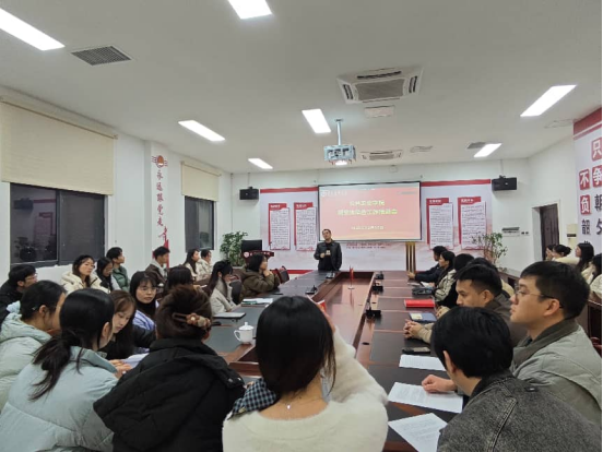 会上,刘俊紧扣党的二十届四中全会精神要义,结合全会提出的重大决策和部署,系统阐述了其核心内涵与实践要求。他联系学科特色与学院人才培养实际,通过对往年研究生就业及申博情况的深入剖析,分享了个人在学术深造与职业发展方面的经验。针对当前就业形势,他围绕在读期间如何夯实科研基础、提升专业能力,科学制定个人职业规划,以及拓宽就业视野等问题,提出了具体而中肯的建议,帮助同学们进一步明晰发展方向、增强发展信心。